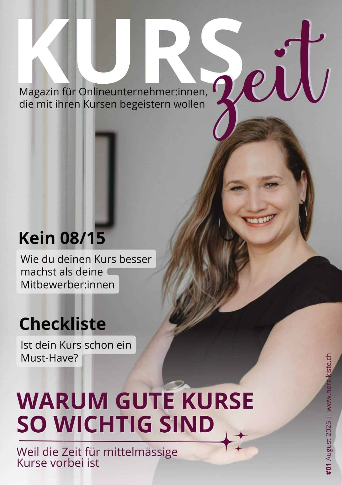 Dein Kurs darf zu einem echten Must-Have und zum Kundenliebling werden - das Magazin KURSzeit unterstützt dich dabei. So, dass deine Kurse nicht mehr mittelmässig und 08/15 sind, sondern deine Kund:innen so sehr begeistern, dass sie deine grössten Fans werden. Dass sie dich weiter empfehlen und deinen nächsten Kurs kaum erwarten können.